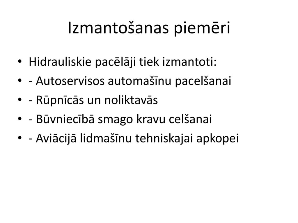 Izmantošanas piemēri• Hidrauliskie pacēlāji tiek izmantoti: