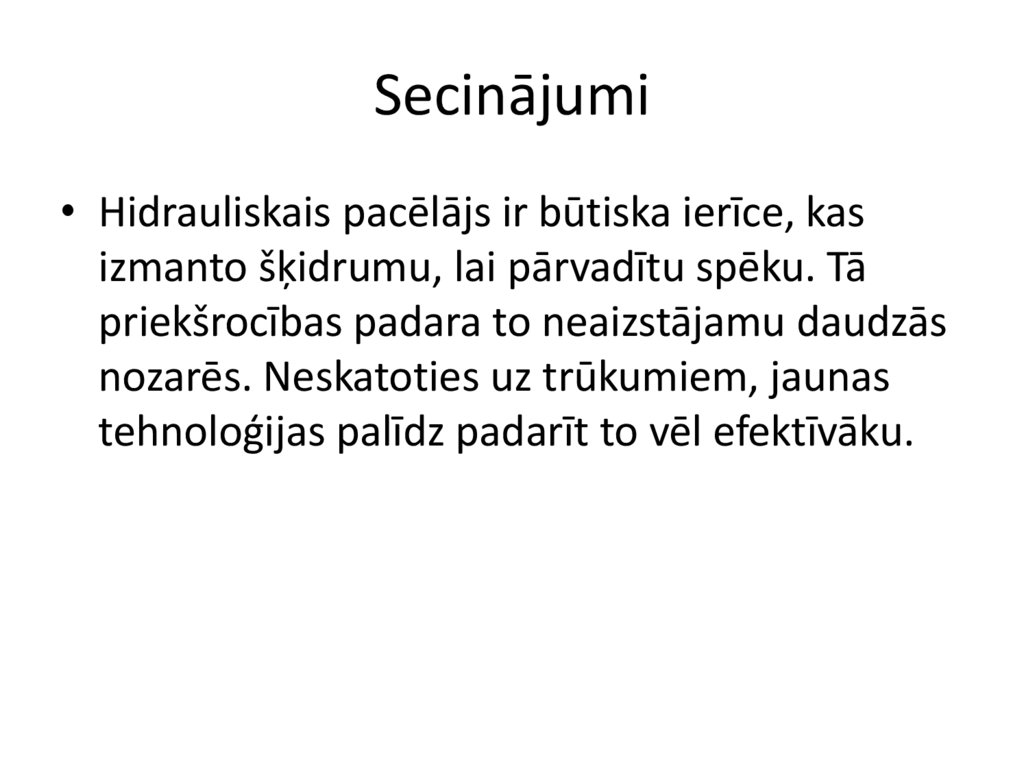 Secinājumi• Hidrauliskais pacēlājs ir būtiska ierīce, kas