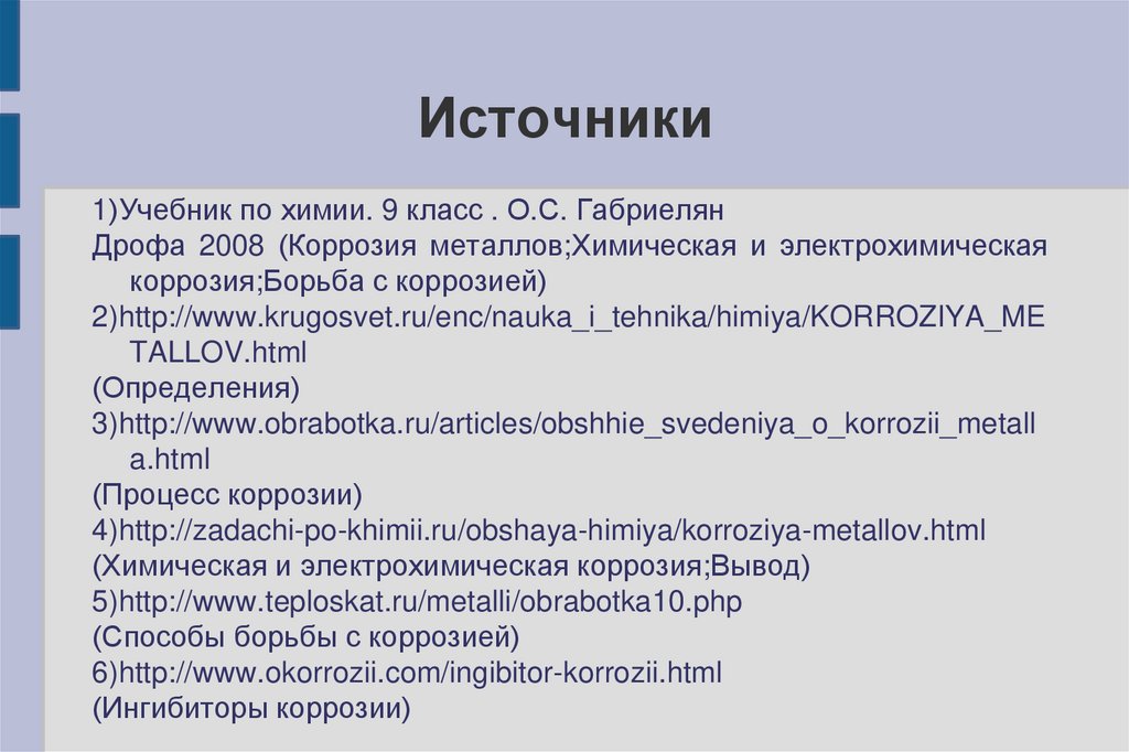 1)Учебник по химии. 9 класс . О.С. ГабриелянДрофа 2008 (Коррозия металлов;Химическая и электрохимическая