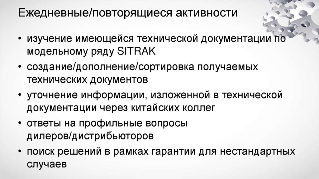 Ежедневные/повторящиеся активности• изучение имеющейся технической документации по
