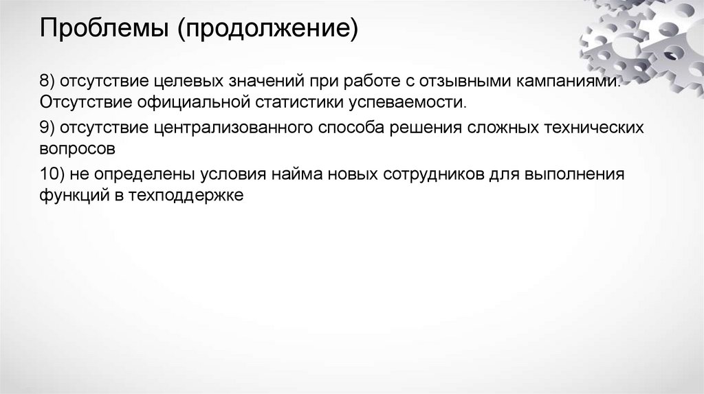 Проблемы (продолжение)8) отсутствие целевых значений при работе с отзывными кампаниями.