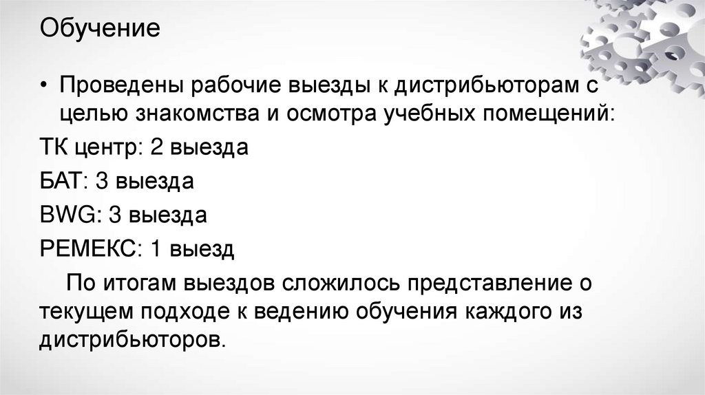 Обучение• Проведены рабочие выезды к дистрибьюторам с