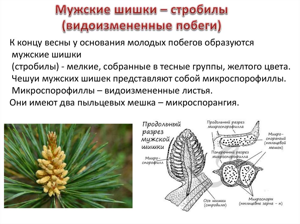 Чешуи мужских шишек представляют собой микроспорофиллы.