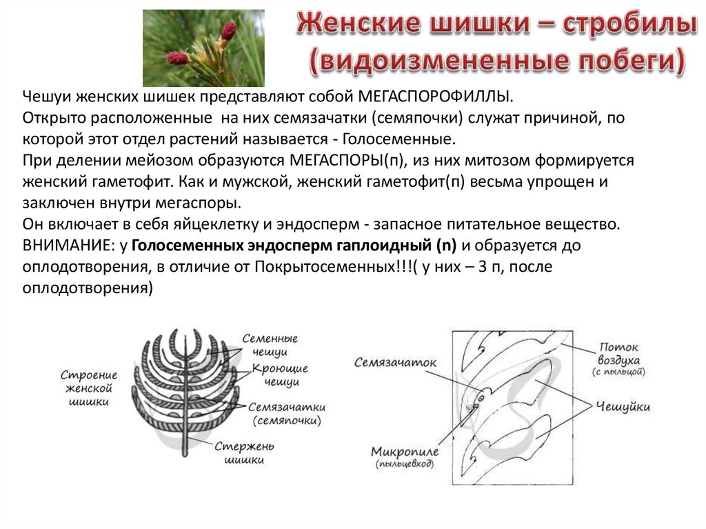Чешуи женских шишек представляют собой МЕГАСПОРОФИЛЛЫ.Открыто расположенные на них семязачатки (семяпочки) служат причиной, по