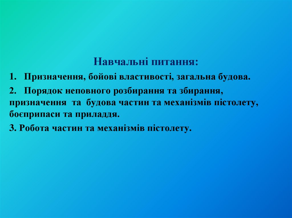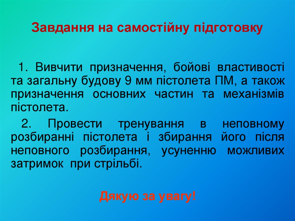 1. Вивчити призначення, бойові властивостіта загальну будову 9 мм пістолета ПМ, а також