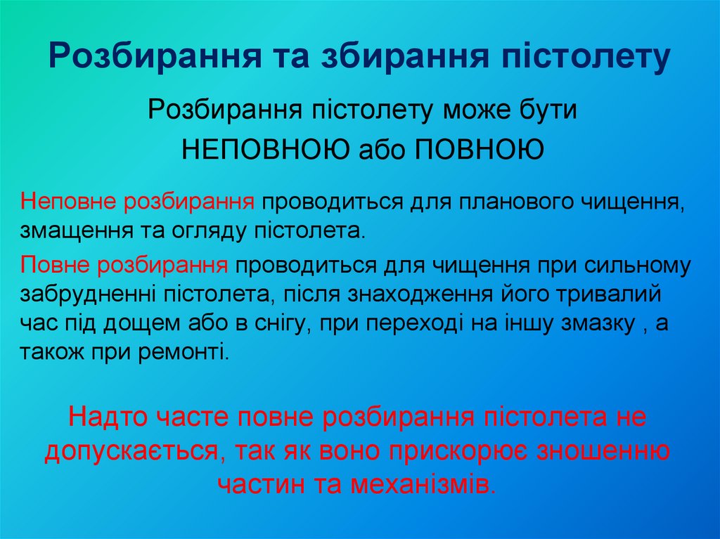 Розбирання пістолету може бутиНЕПОВНОЮ або ПОВНОЮ