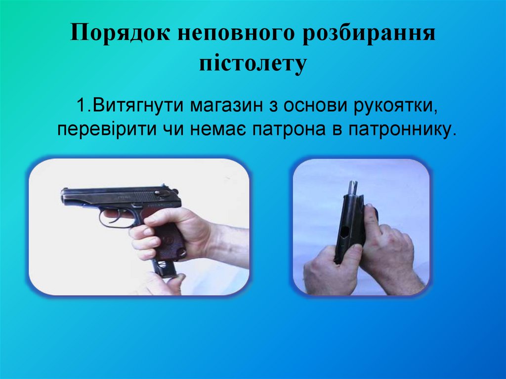 1.Витягнути магазин з основи рукоятки,перевірити чи немає патрона в патроннику.