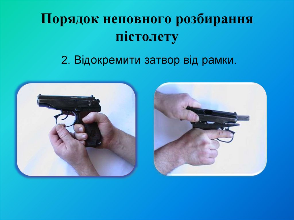 2. Відокремити затвор від рамки.14. Порядок неповного розбирання пістолету