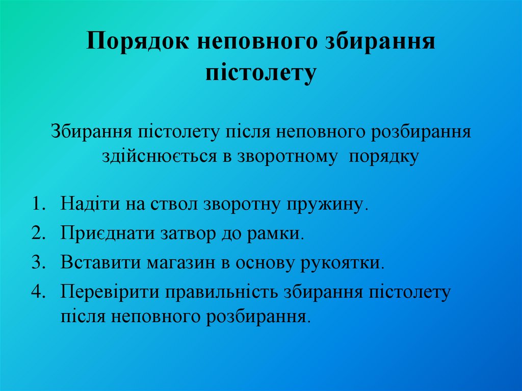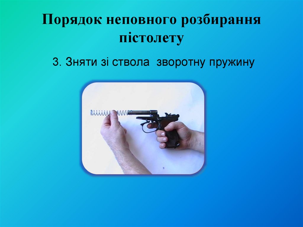 3. Зняти зі ствола зворотну пружину15. Порядок неповного збирання пістолету Збирання пістолету після неповного розбирання здійснюється в зворотному порядку
