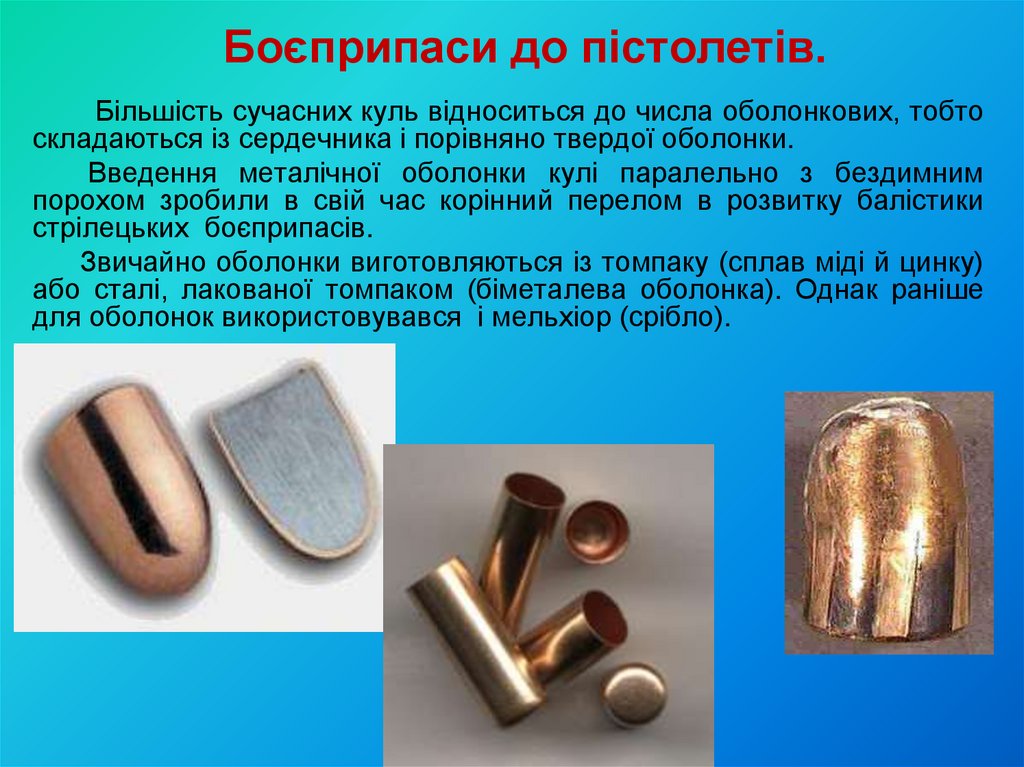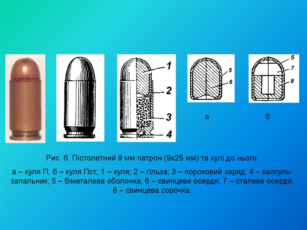 Рис. 6. Пістолетний 9 мм патрон (9х25 мм) та кулі до нього: