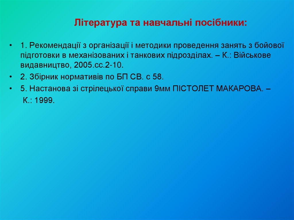 Література та навчальні посібники:• 1. Рекомендації з організації і методики проведення занять з бойової