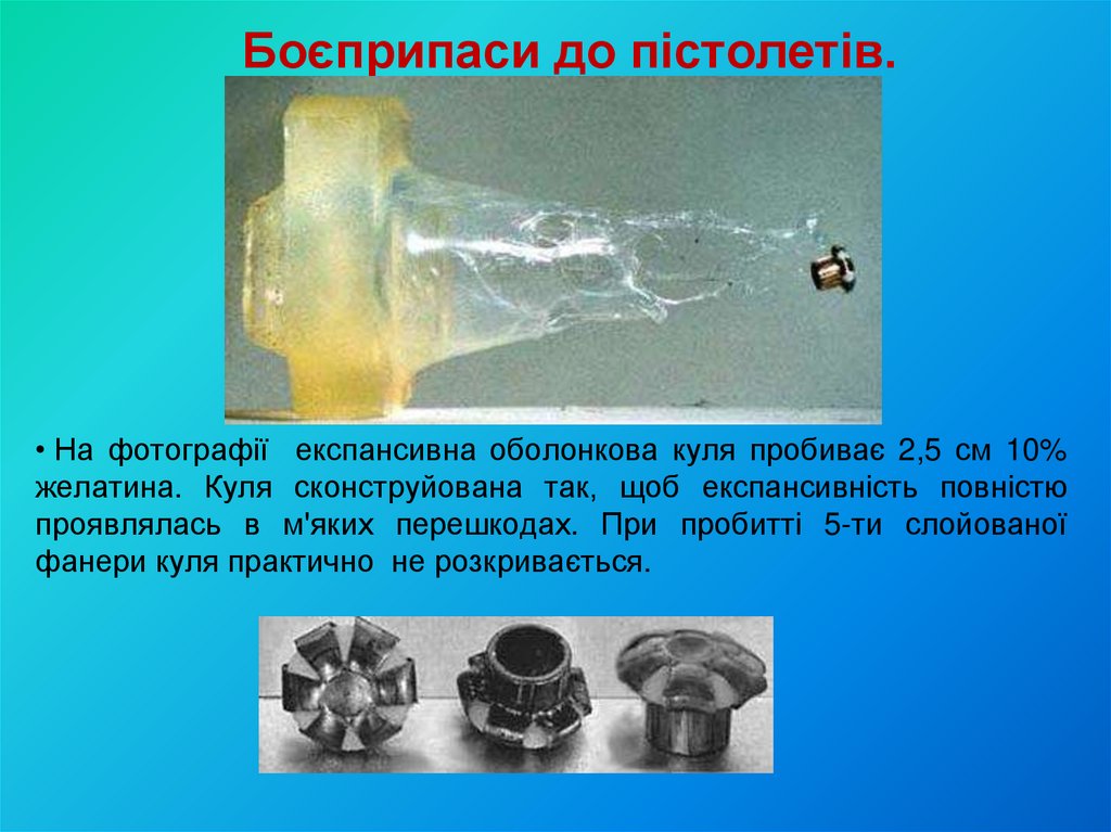 • На фотографії експансивна оболонкова куля пробиває 2,5 см 10%желатина. Куля сконструйована так, щоб експансивність повністю