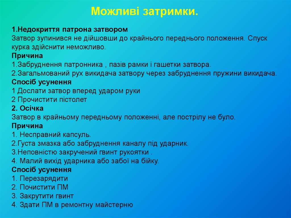 1.Недокриття патрона затворомЗатвор зупинився не дійшовши до крайнього переднього положення. Спуск