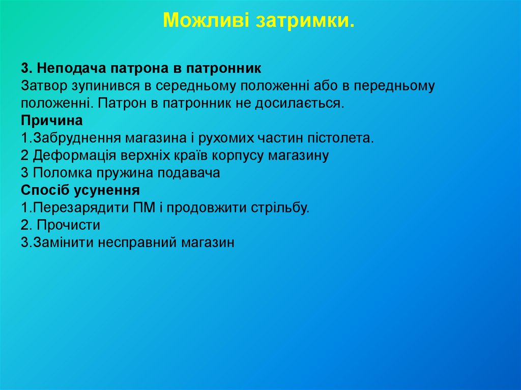 3. Неподача патрона в патронникЗатвор зупинився в середньому положенні або в передньому
