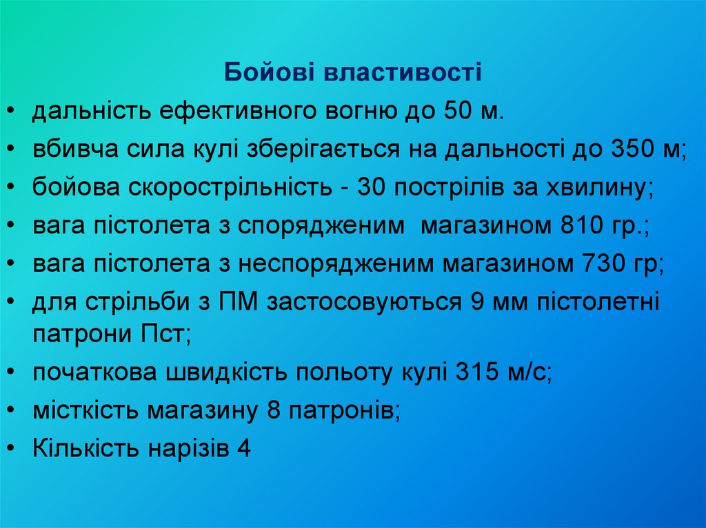 • для стрільби з ПМ застосовуються 9 мм пістолетні