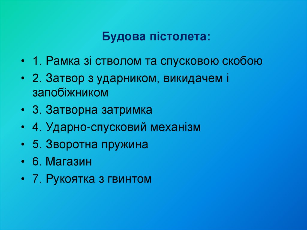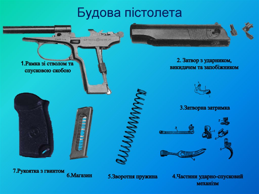 Будова пістолета:• 1. Рамка зі стволом та спусковою скобою
