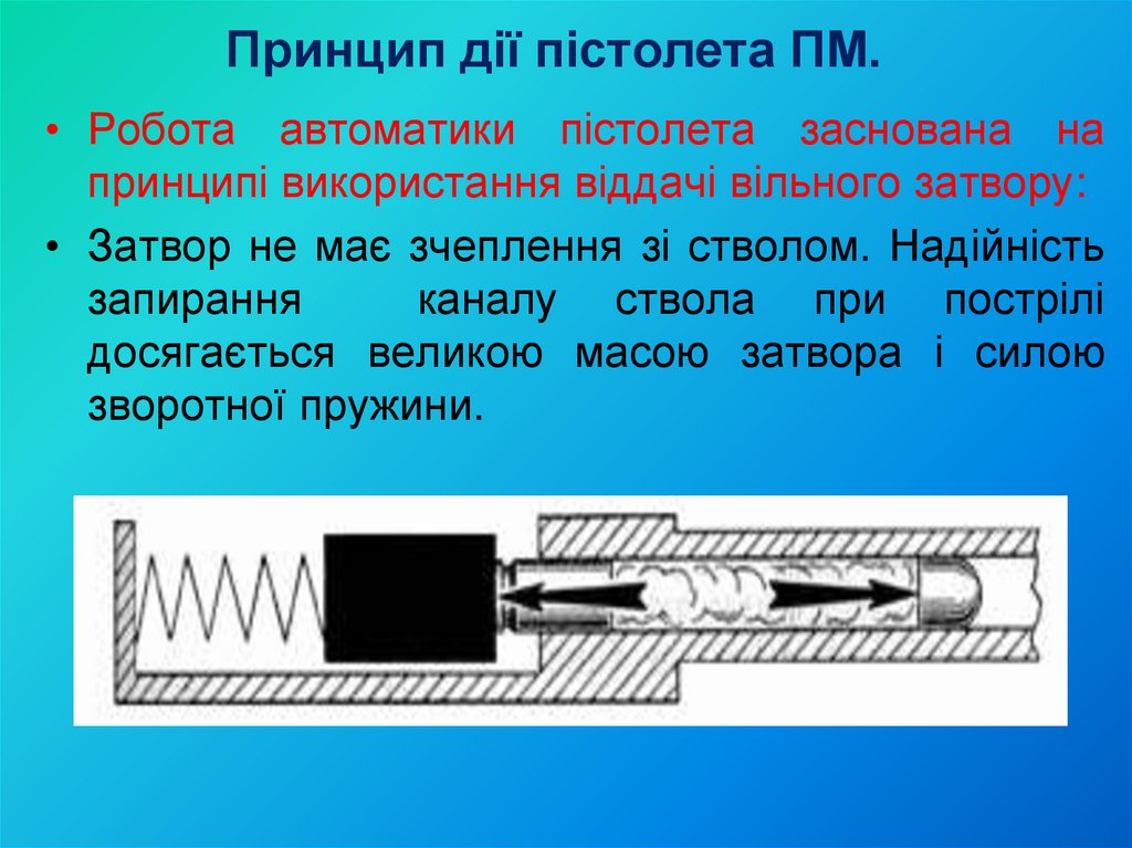 • Робота автоматики пістолета заснована напринципі використання віддачі вільного затвору: