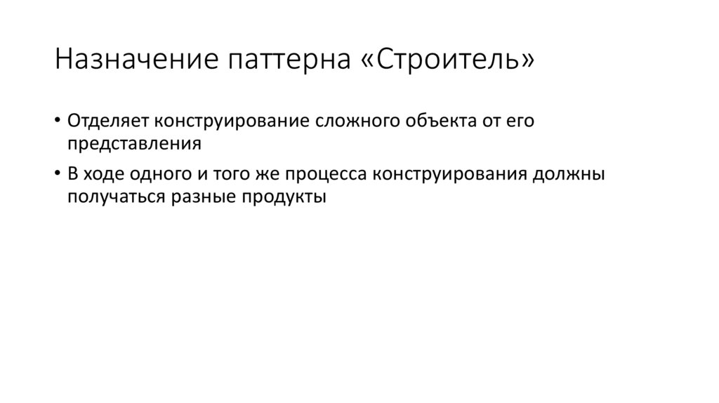 Назначение паттерна «Строитель»• Отделяет конструирование сложного объекта от его