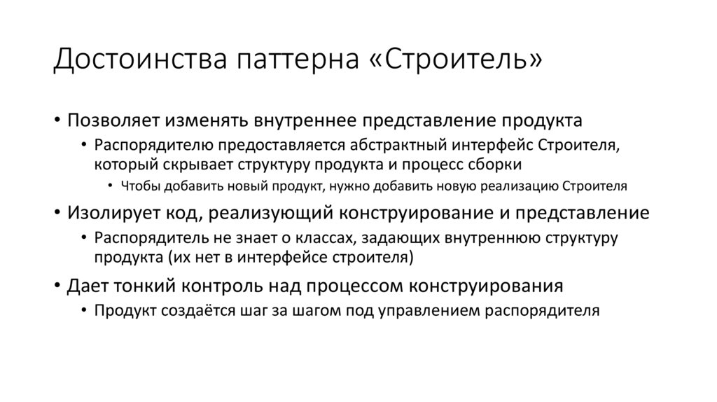Достоинства паттерна «Строитель»• Позволяет изменять внутреннее представление продукта