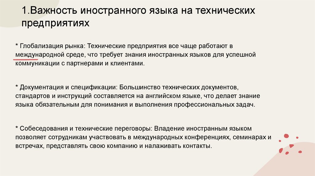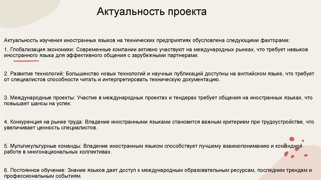 Актуальность проектаАктуальность изучения иностранных языков на технических предприятиях обусловлена следующими факторами: