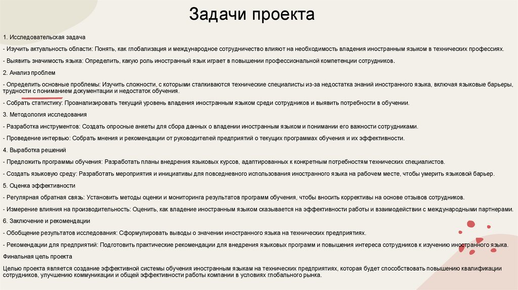 Целью проекта является создание эффективной системы обучения иностранным языкам на технических предприятиях, которая будет способствовать повышению квалификации