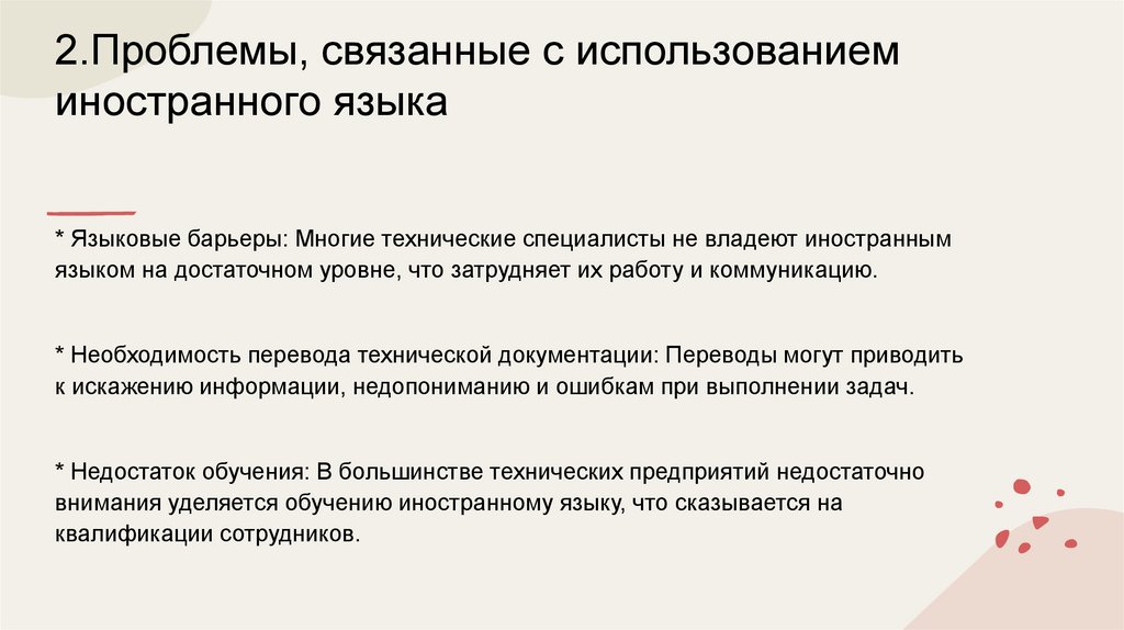 - Определить основные проблемы: Изучить сложности, с которыми сталкиваются технические специалисты из-за недостатка знаний иностранного языка, включая языковые барьеры,