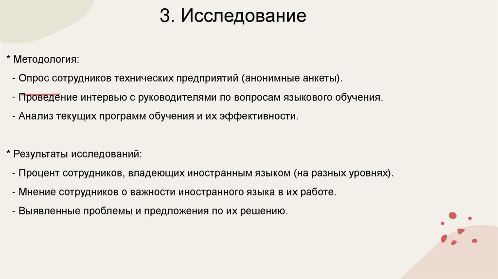 - Рекомендации для предприятий: Подготовить практические рекомендации для внедрения языковых программ и повышения интереса сотрудников к изучению иностранного языка.