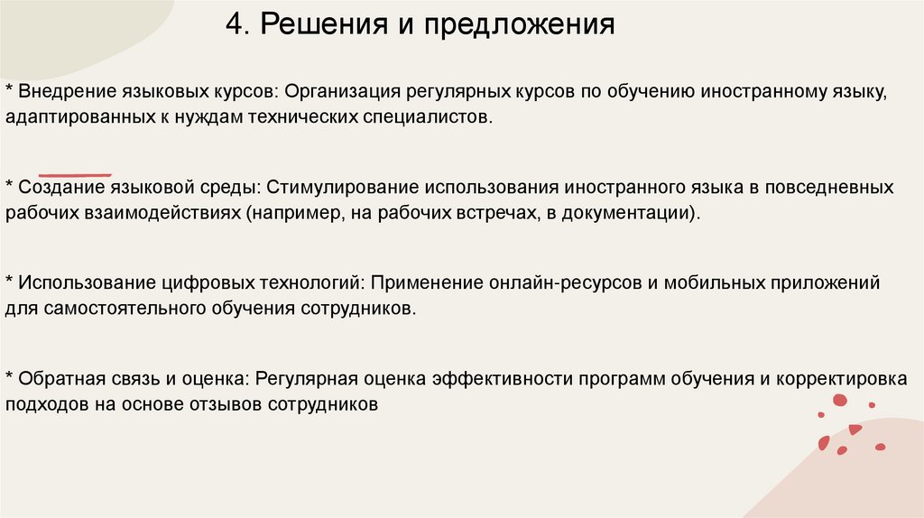 4. Решения и предложения* Внедрение языковых курсов: Организация регулярных курсов по обучению иностранному языку,