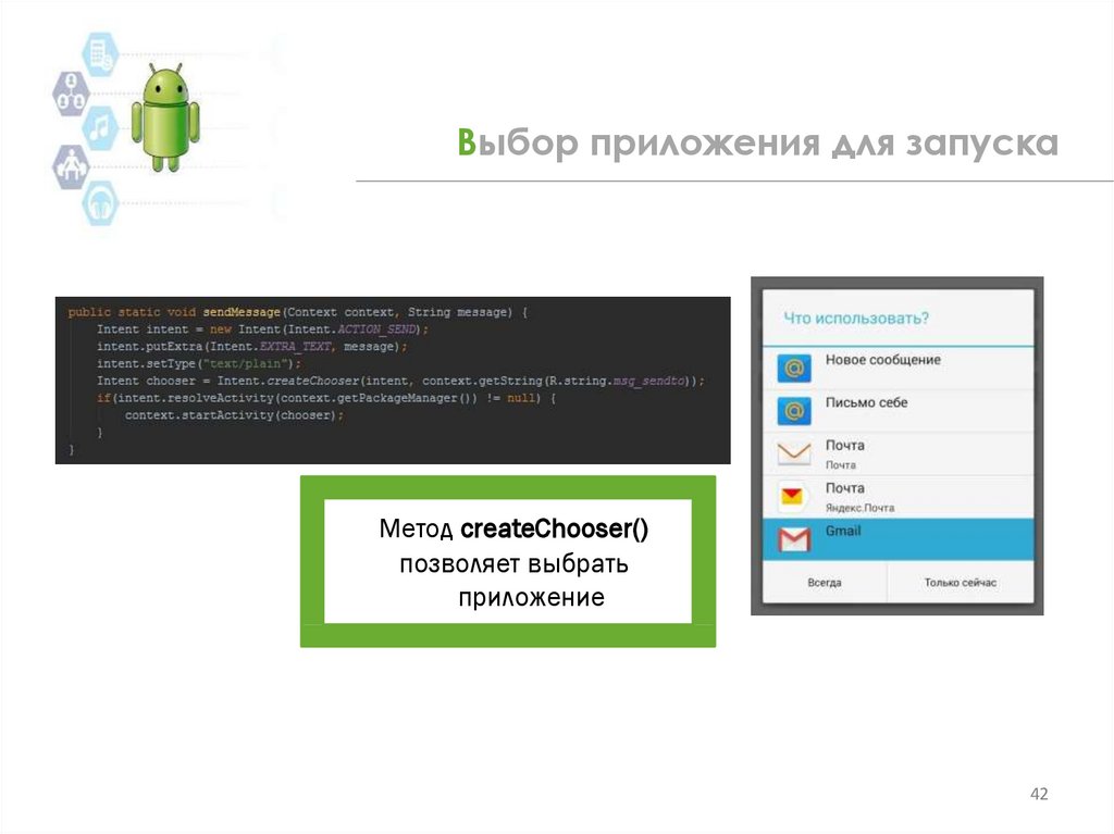 Метод createChooser()позволяет выбрать