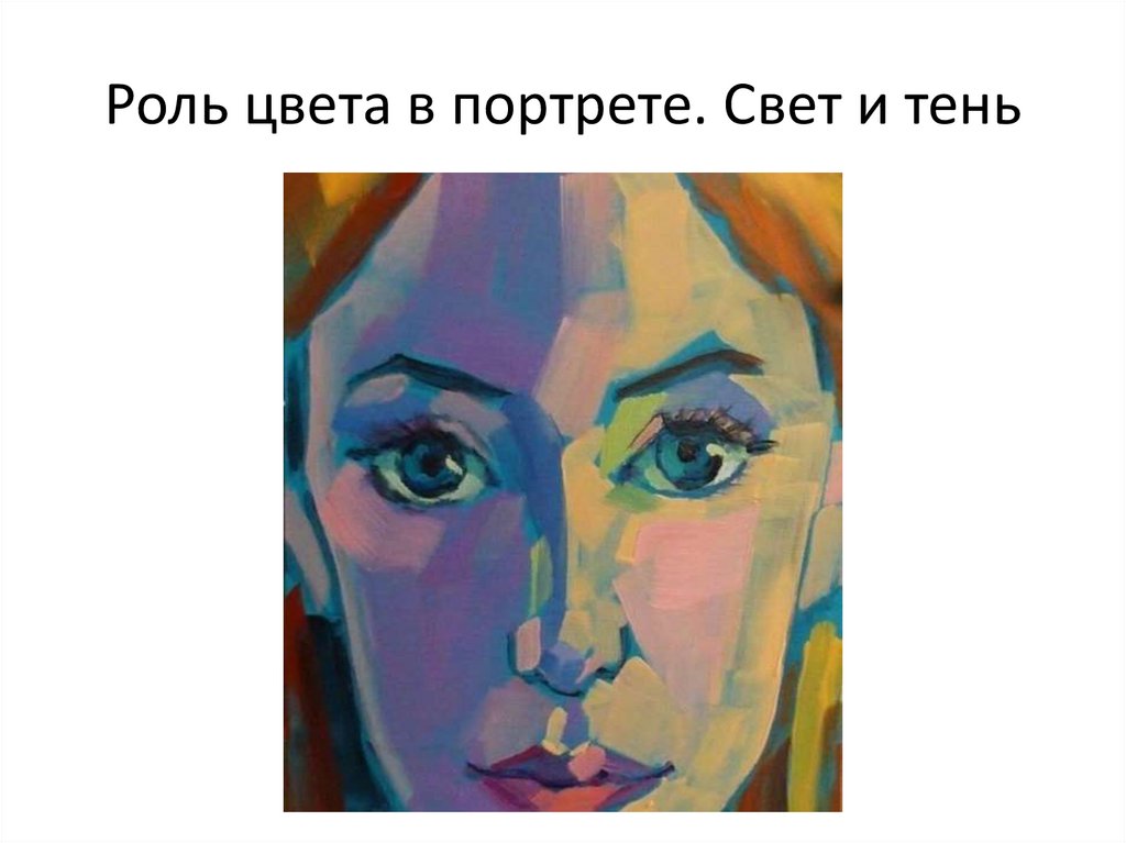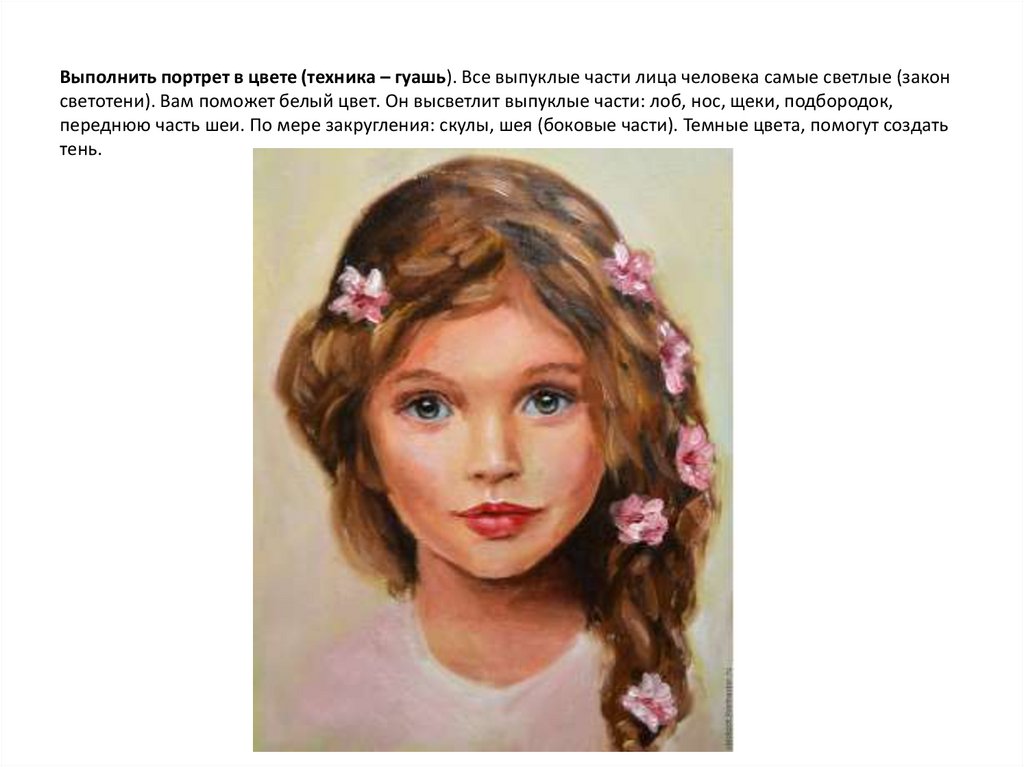 Выполнить портрет в цвете (техника – гуашь). Все выпуклые части лица человека самые светлые (законсветотени). Вам поможет белый цвет. Он высветлит выпуклые части: лоб, нос, щеки, подбородок,