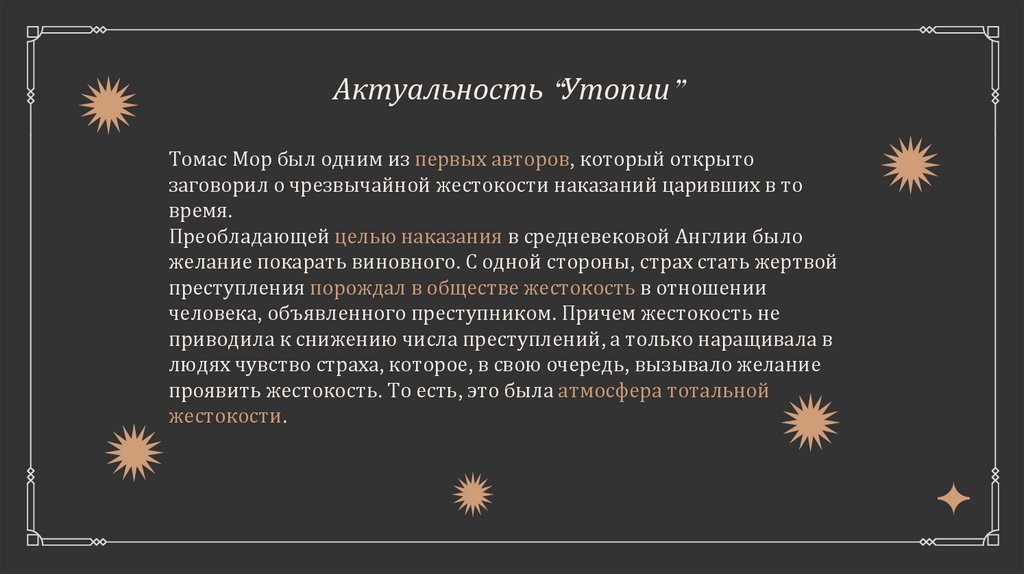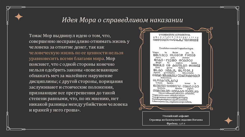 Идея Мора о справедливом наказанииТомас Мор выдвинул идею о том, что,