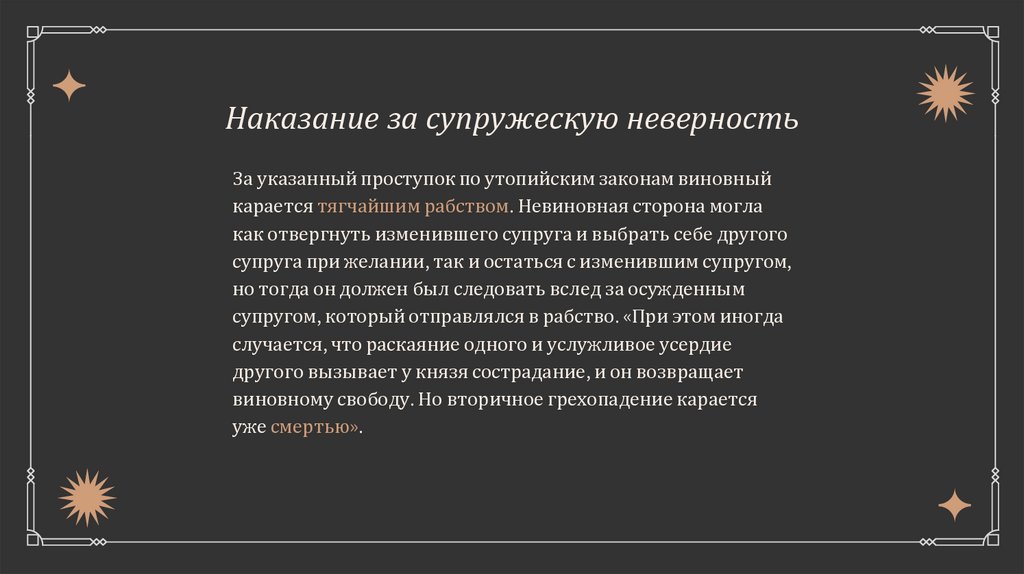 Наказание за супружескую неверностьЗа указанный проступок по утопийским законам виновный