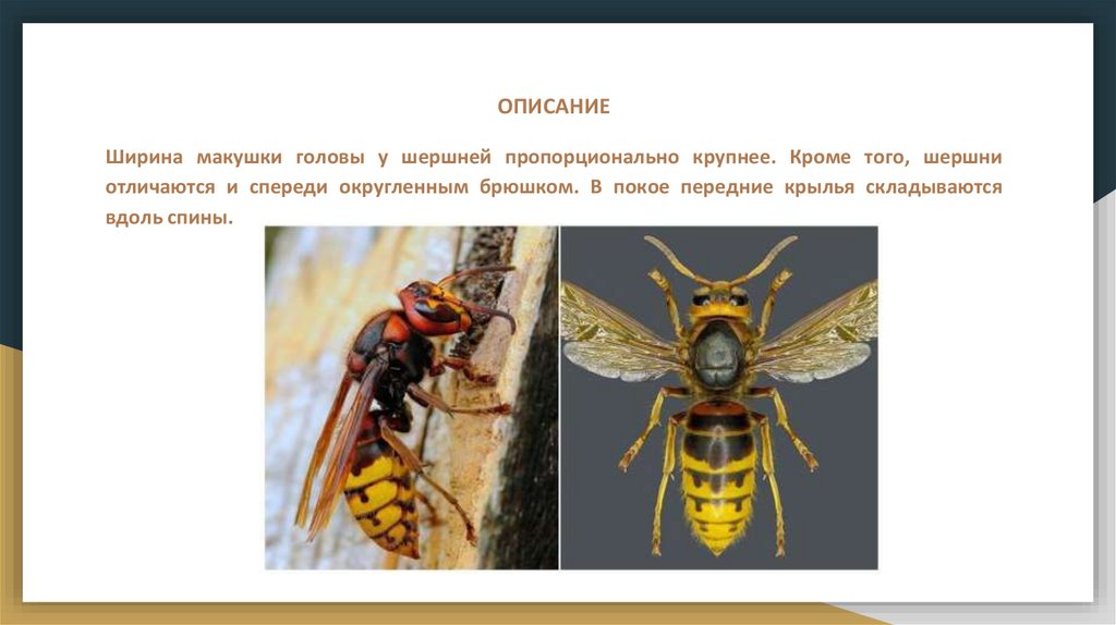 ОПИСАНИЕШирина макушки головы у шершней пропорционально крупнее. Кроме того, шершни