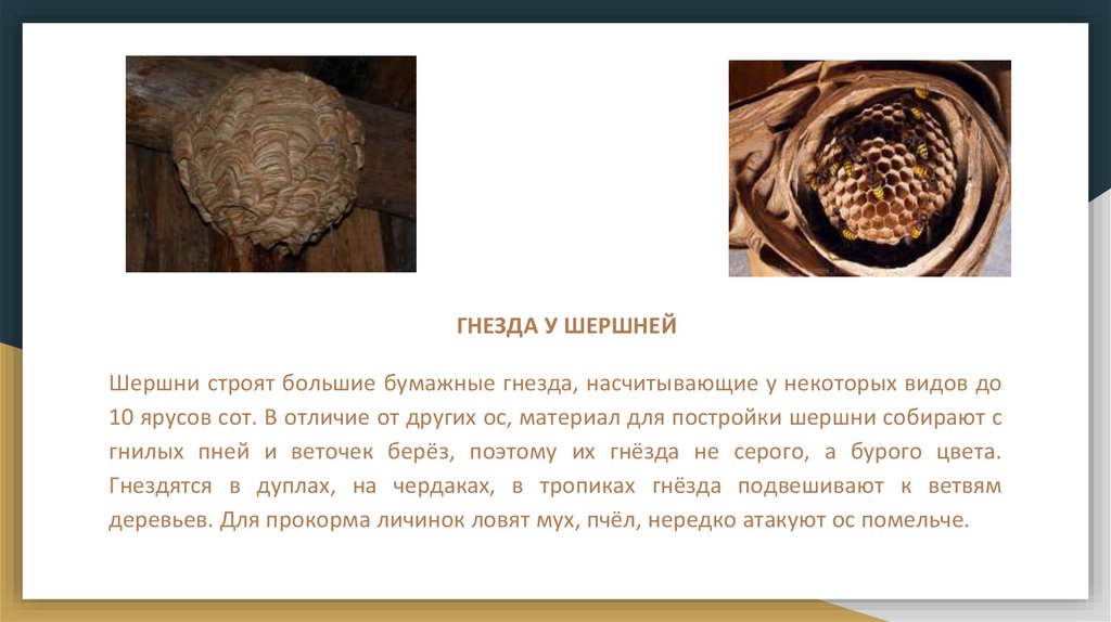 ГНЕЗДА У ШЕРШНЕЙШершни строят большие бумажные гнезда, насчитывающие у некоторых видов до