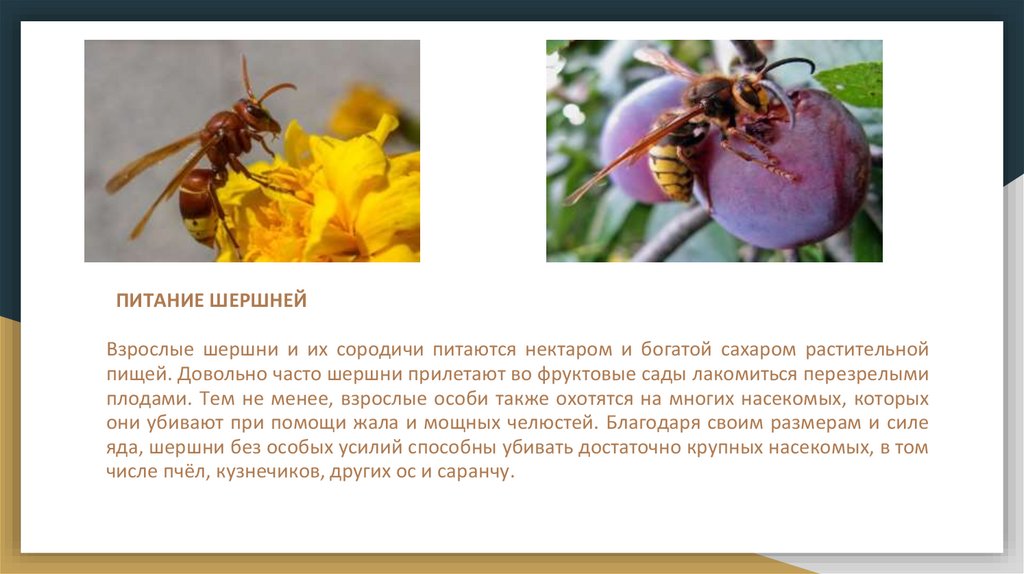 ПИТАНИЕ ШЕРШНЕЙВзрослые шершни и их сородичи питаются нектаром и богатой сахаром растительной