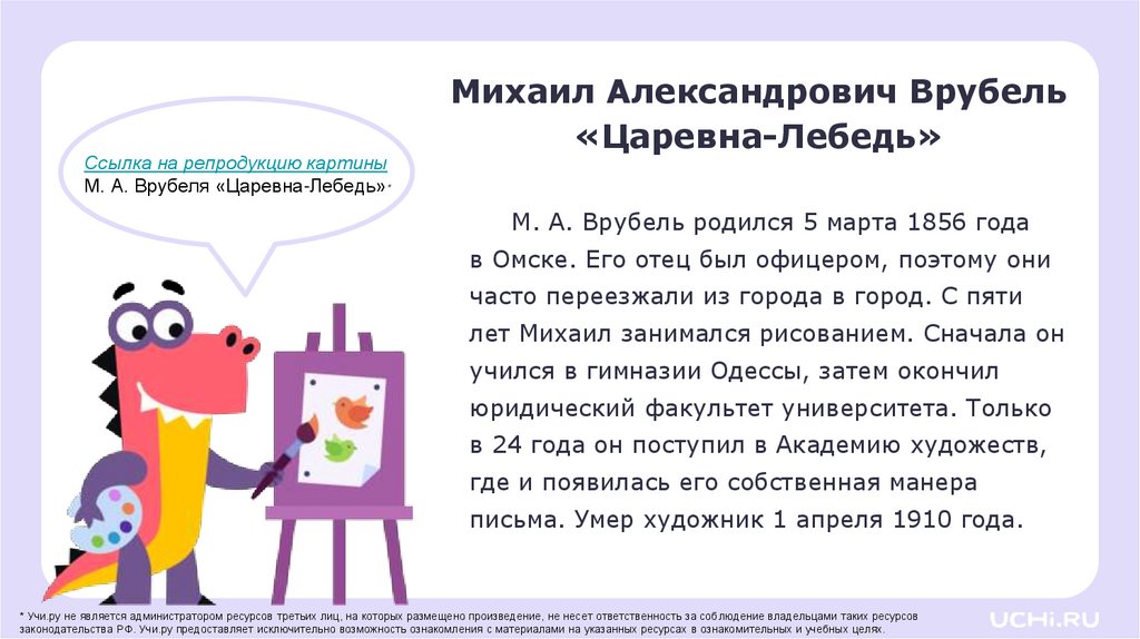 Ссылка на репродукцию картиныМ. А. Врубеля «Царевна-Лебедь»*
