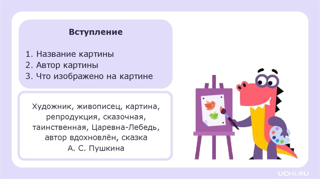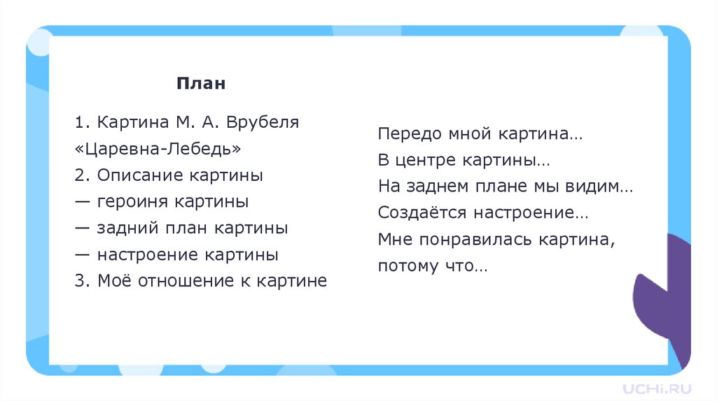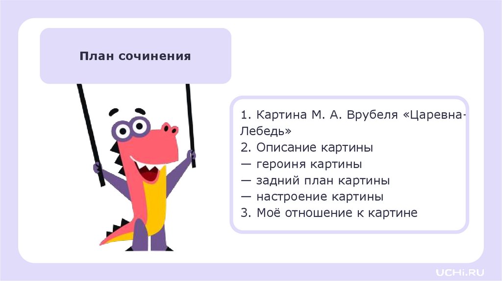 План сочинения1. Картина М. А. Врубеля «ЦаревнаЛебедь»