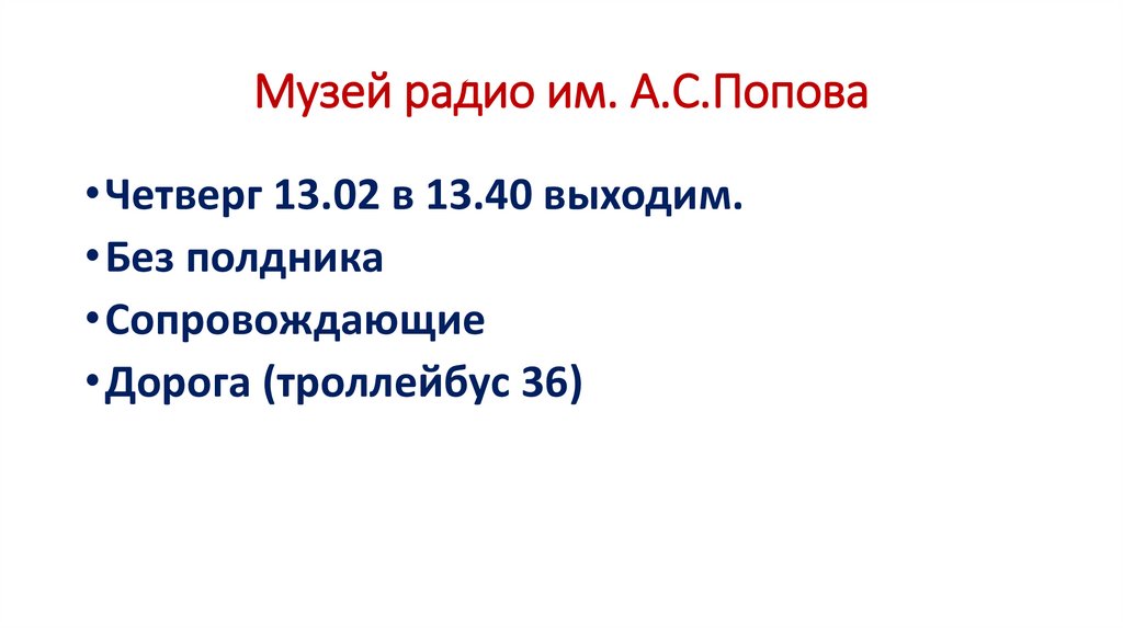 Музей радио им. А.С.Попова• Четверг 13.02 в 13.40 выходим.