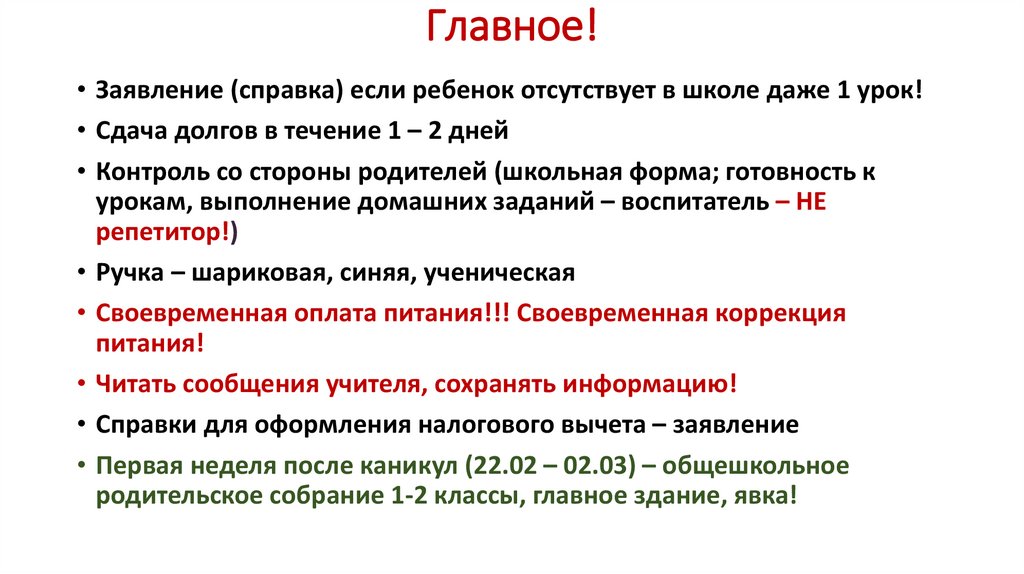 Главное!• Заявление (справка) если ребенок отсутствует в школе даже 1 урок!