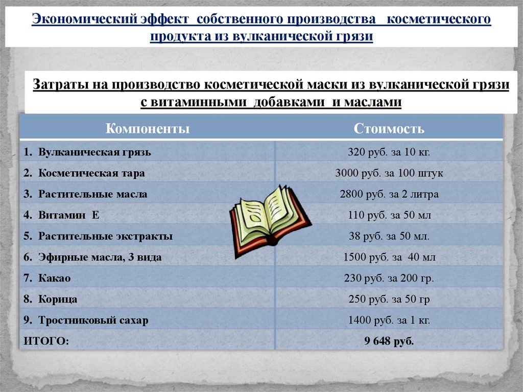 Экономический эффект собственного производства косметическогопродукта из вулканической грязи