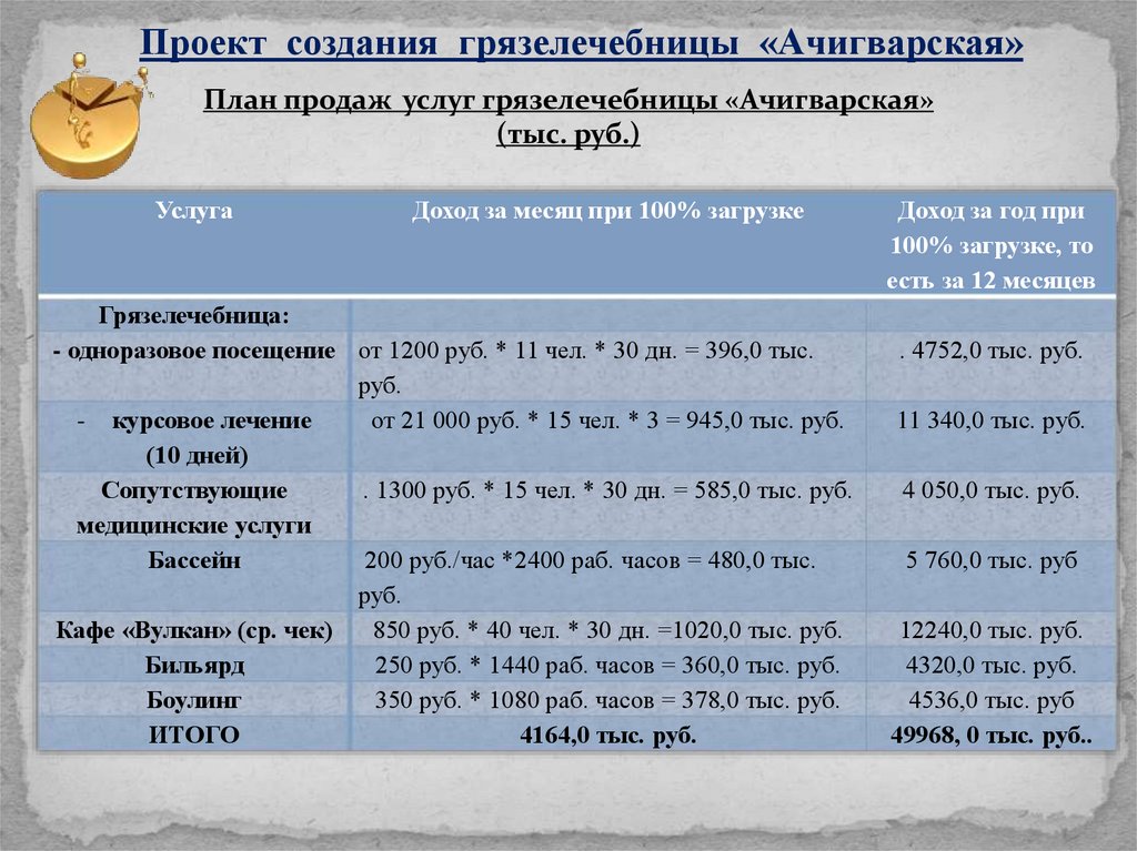 Проект создания грязелечебницы «Ачигварская»План продаж услуг грязелечебницы «Ачигварская»