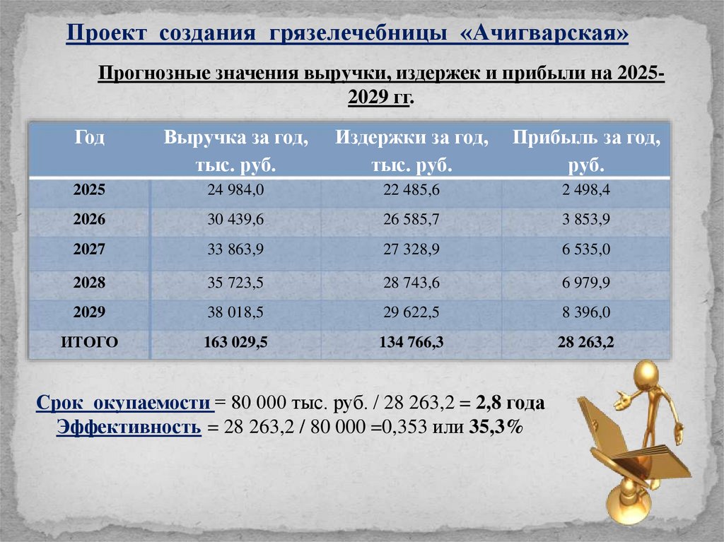 Проект создания грязелечебницы «Ачигварская»Прогнозные значения выручки, издержек и прибыли на 20252029 гг.
