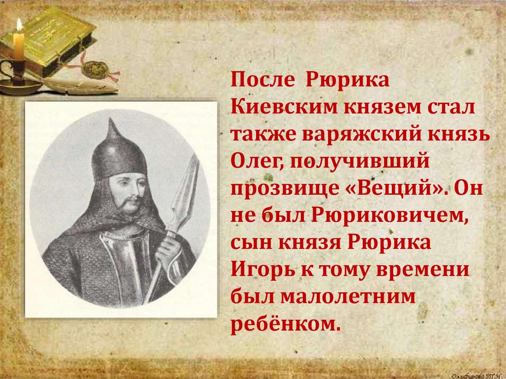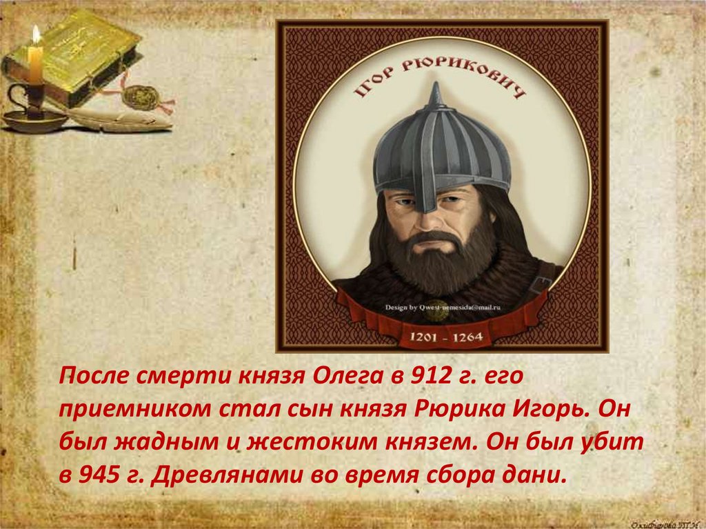 После смерти князя Олега в 912 г. егоприемником стал сын князя Рюрика Игорь. Он