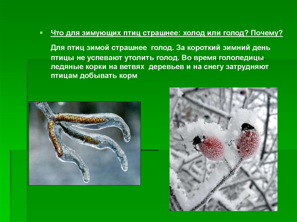 Что для зимующих птиц страшнее: холод или голод? Почему?Для птиц зимой страшнее голод. За короткий зимний день
