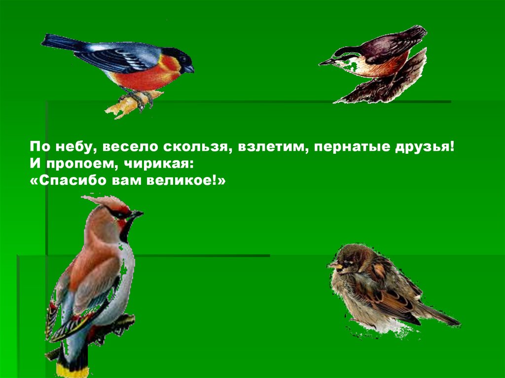 По небу, весело скользя, взлетим, пернатые друзья!И пропоем, чирикая:
