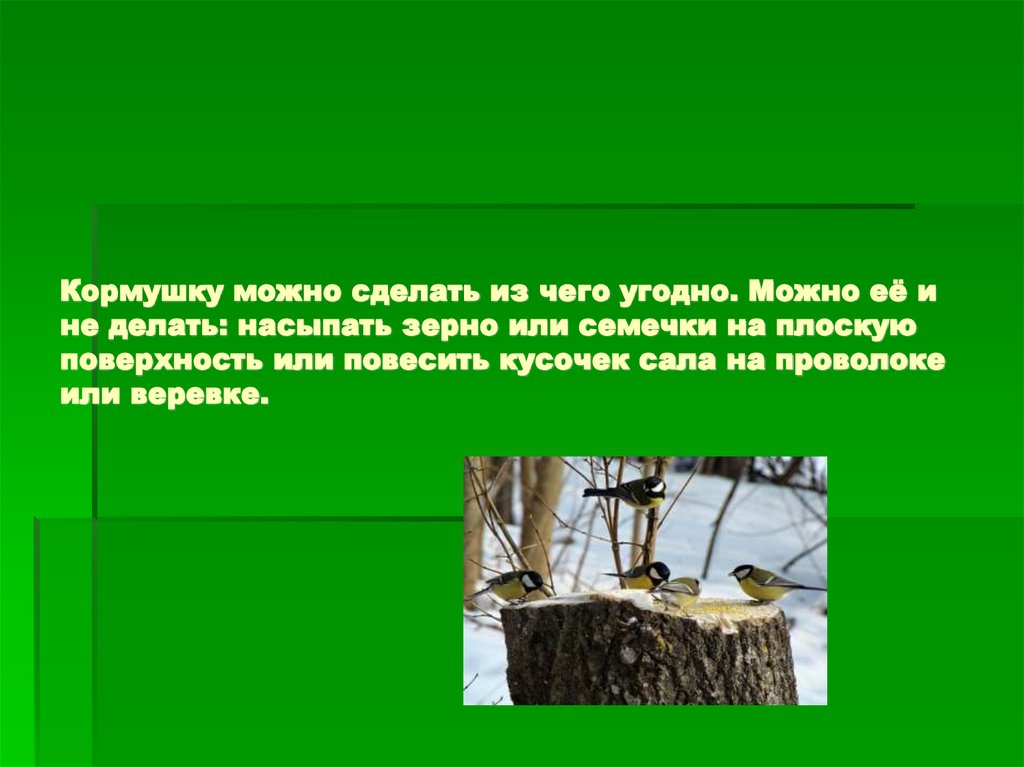 Кормушку можно сделать из чего угодно. Можно её ине делать: насыпать зерно или семечки на плоскую