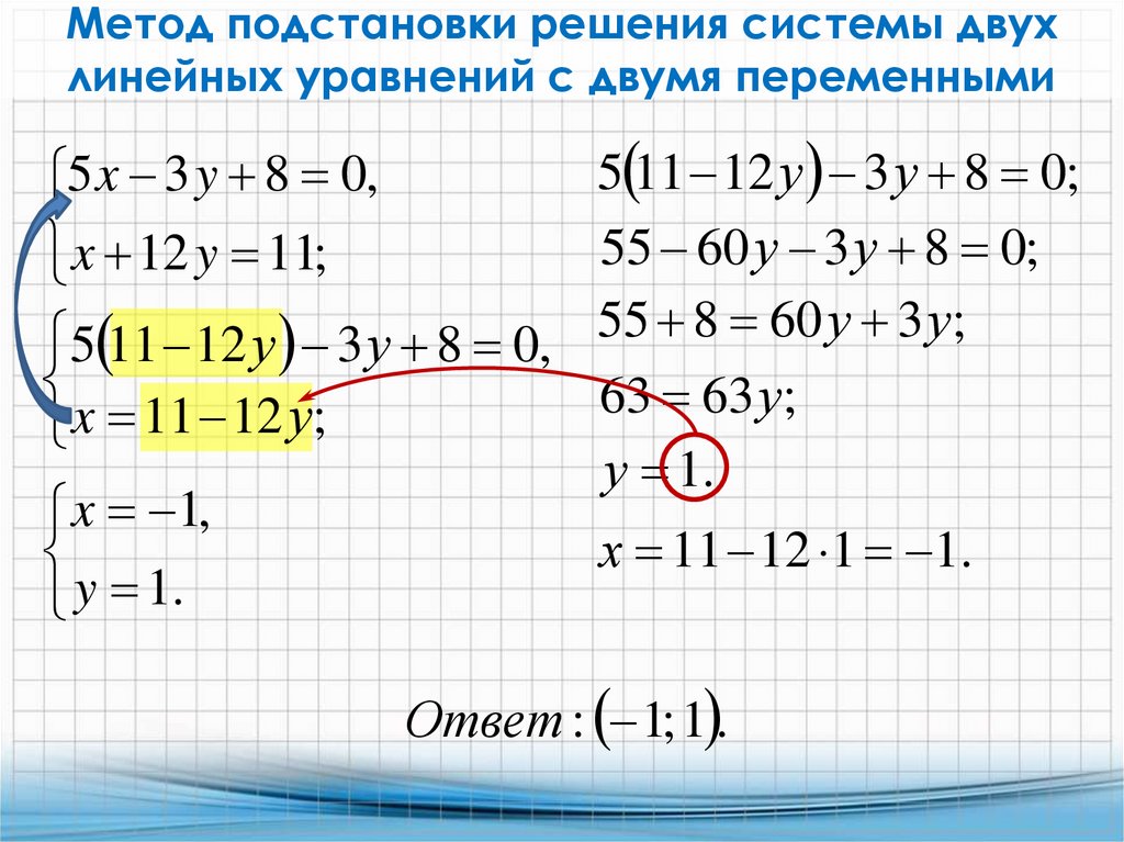 Метод подстановки решения системы двухлинейных уравнений с двумя переменными