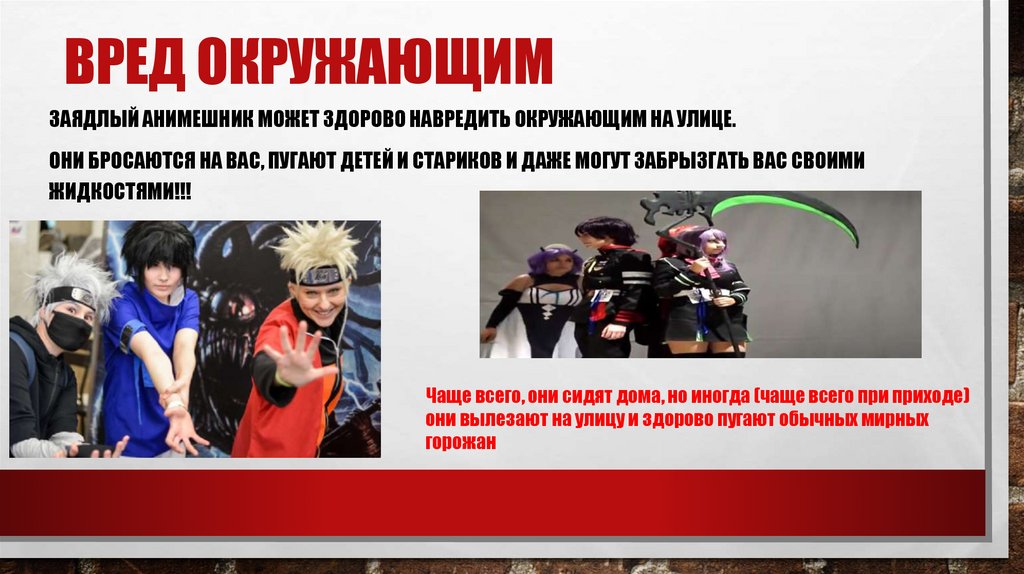 ВРЕД ОКРУЖАЮЩИМЗАЯДЛЫЙ АНИМЕШНИК МОЖЕТ ЗДОРОВО НАВРЕДИТЬ ОКРУЖАЮЩИМ НА УЛИЦЕ.