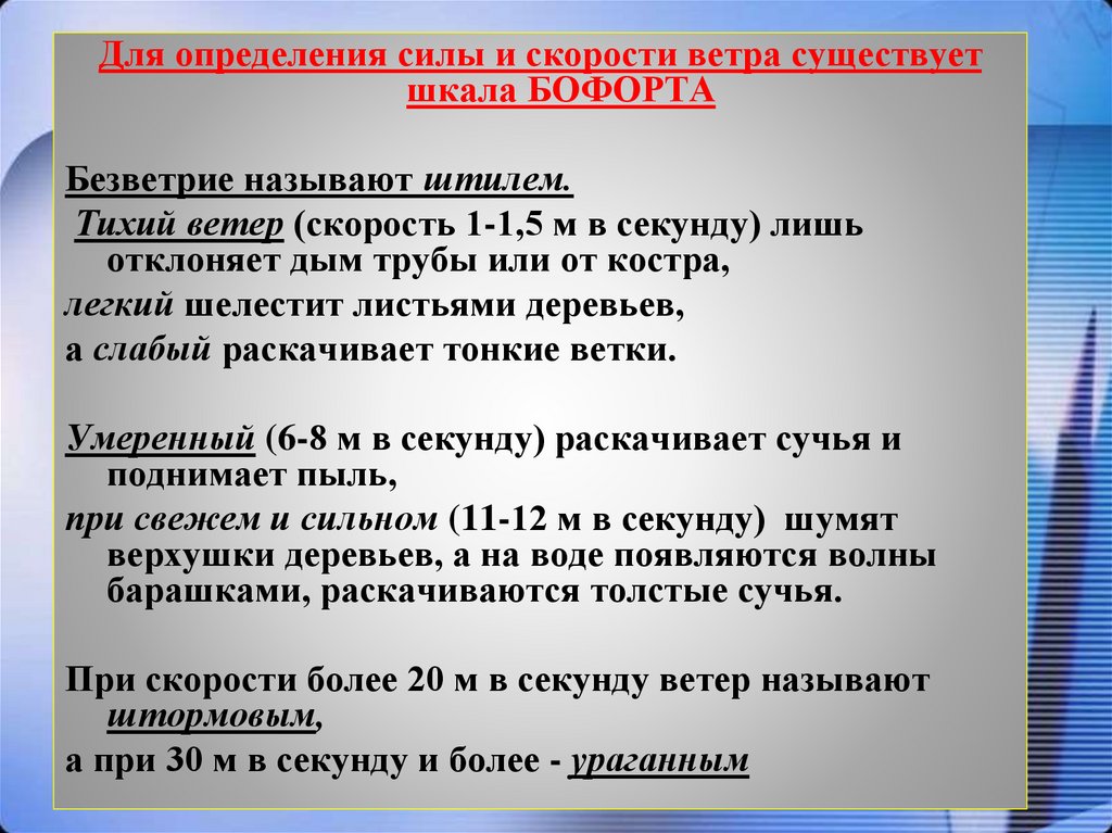 Для определения силы и скорости ветра существуетшкала БОФОРТА