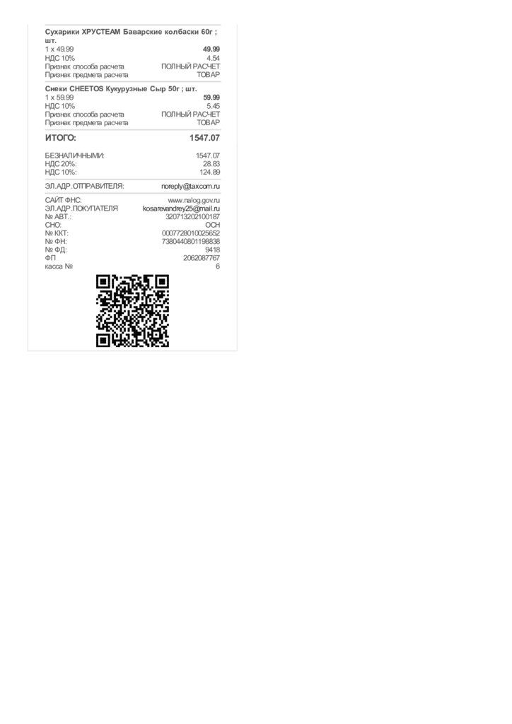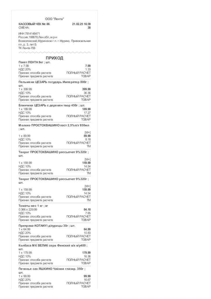 ООО "Лента"КАССОВЫЙ ЧЕК №: 86